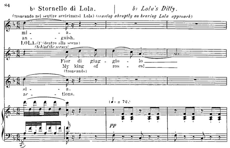 Fior di Giaggiolo. Aria for Soprano (Lola). P. Mascagni: Cavalleria Rusticana, Act I. Vocal Score, Ed. Schirmer. 1891. Italian/Englih (PD). Sheet Music (A4). 2pp. High Resolution scans (600 dpi) for immediate download.